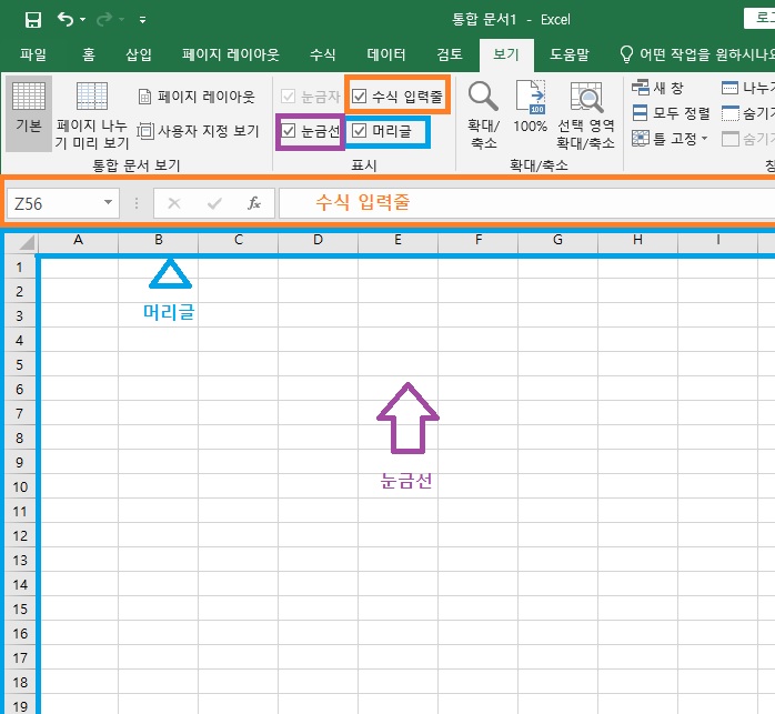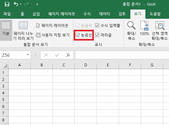 눈금선과 머리글, 수식 입력줄 필요에 따라 사용하시면됩니다.