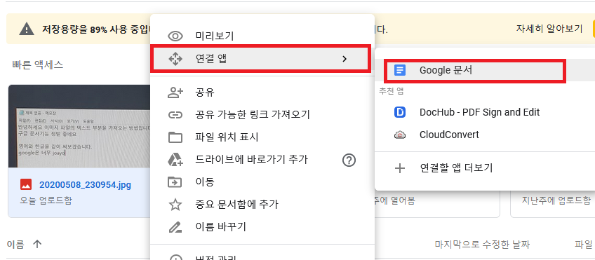 이미지 우측클릭 하면 연결 앱에 Google 문서 클릭!