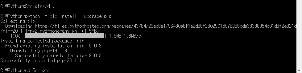 파이썬 설치경로에서 python -m pip install --upgrade pip 명령어를 치니 업데이트가 된다.