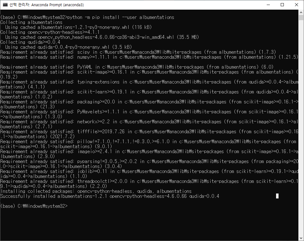 아나콘다 프롬프트에서 python -m pip install --user albumentations 실행시 잘 설치 된다.