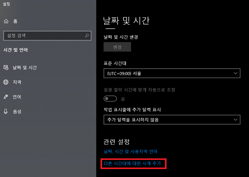 2. 날짜 및 시간 탭에서 밑으로 조금 내리면 -> 다른 시간대에 대한 시계추가