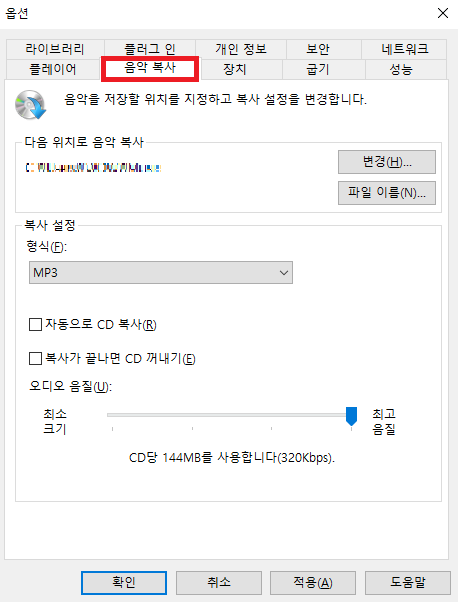 2. 위에 음악 복사 탭에 들어갑니다. (저장경로 확인)