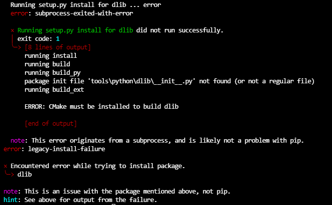 일단 간단히 pip install face_recognition 커맨드창에 쳐보니 역시나 간단히 설치되지 않는다.