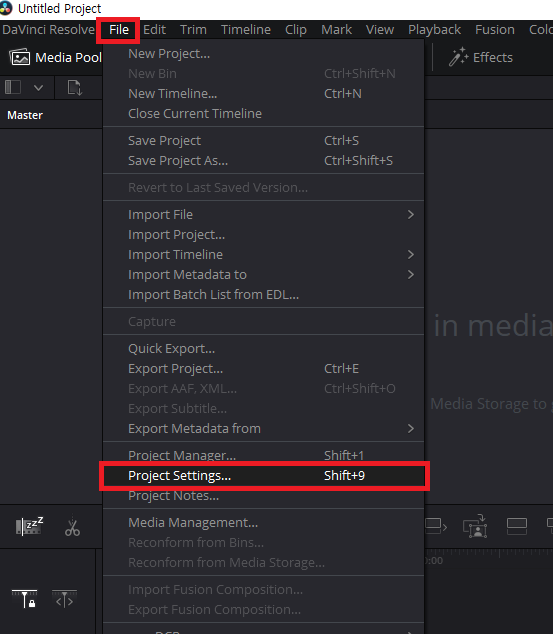 다빈치 리졸브에서 File 탭에 Project Settings을 클릭해 줍니다.